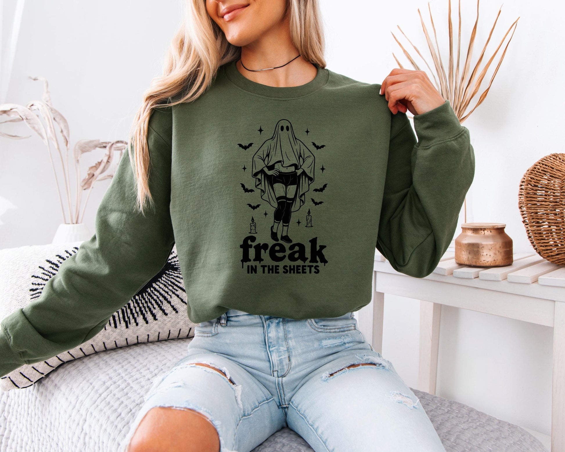 Featuring a whimsical design of a sassy ghost dressed to impress, paired with the cheeky phrase "Freak in the Sheets," this sweatshirt is sure to stand out. Whether you're dressing up for Halloween or just want to add some fun to your casual wear, this spooky ghost sweatshirt is a must-have. It also makes a fantastic gift for friends or family who love humor, Halloween, or unique, eye-catching apparel.