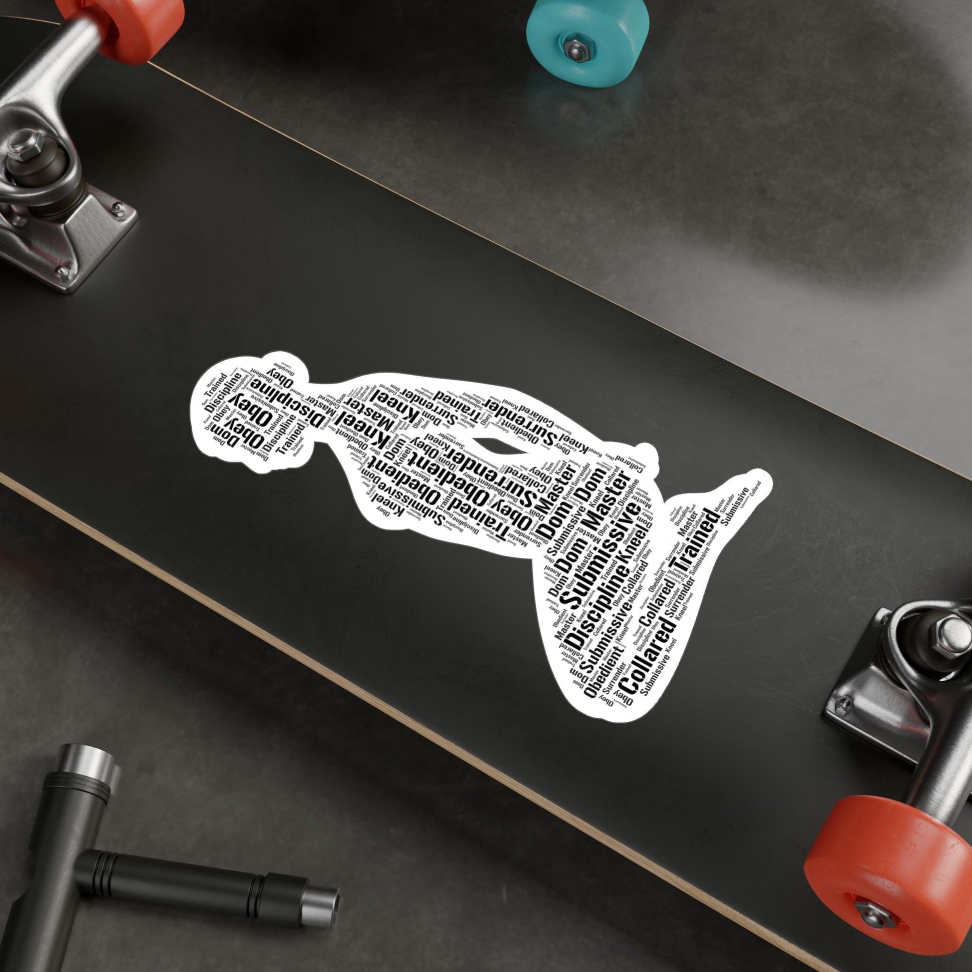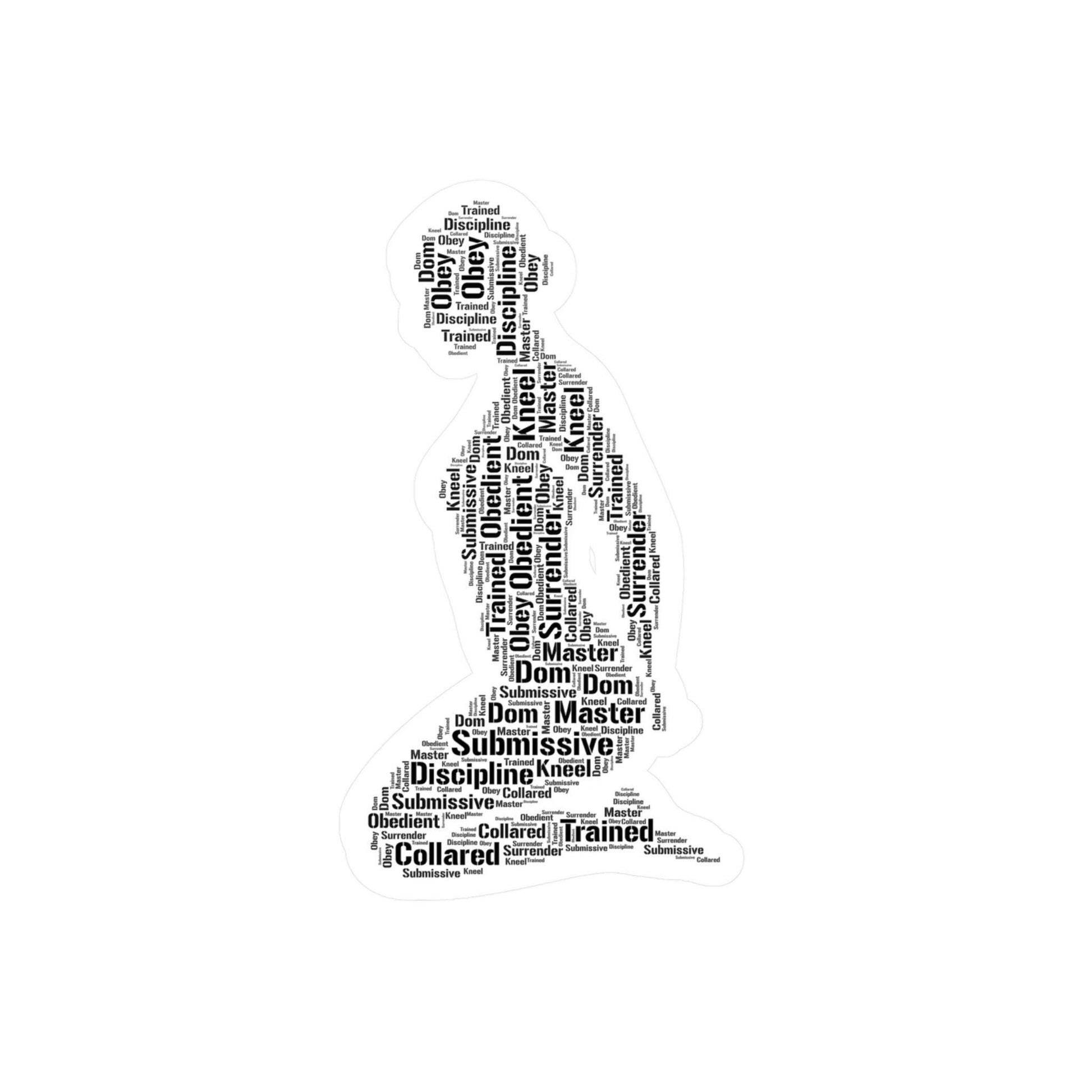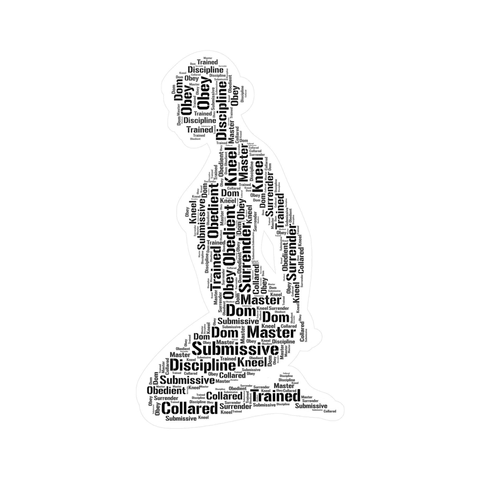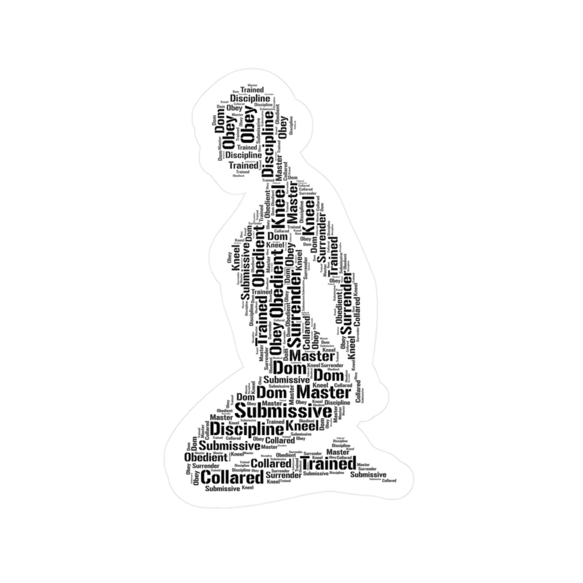 Crafted in the shape of a kneeling submissive silhouette, the design features a curated word cloud of traits that represent the heart of submission: trust, loyalty, obedience, self-awareness, and confidence. Each word is intentionally placed to highlight the mental, emotional, and sensual dimensions of being submissive in a D/s relationship. This isn’t just a sticker — it’s a reflection of inner strength, vulnerability, and empowerment.