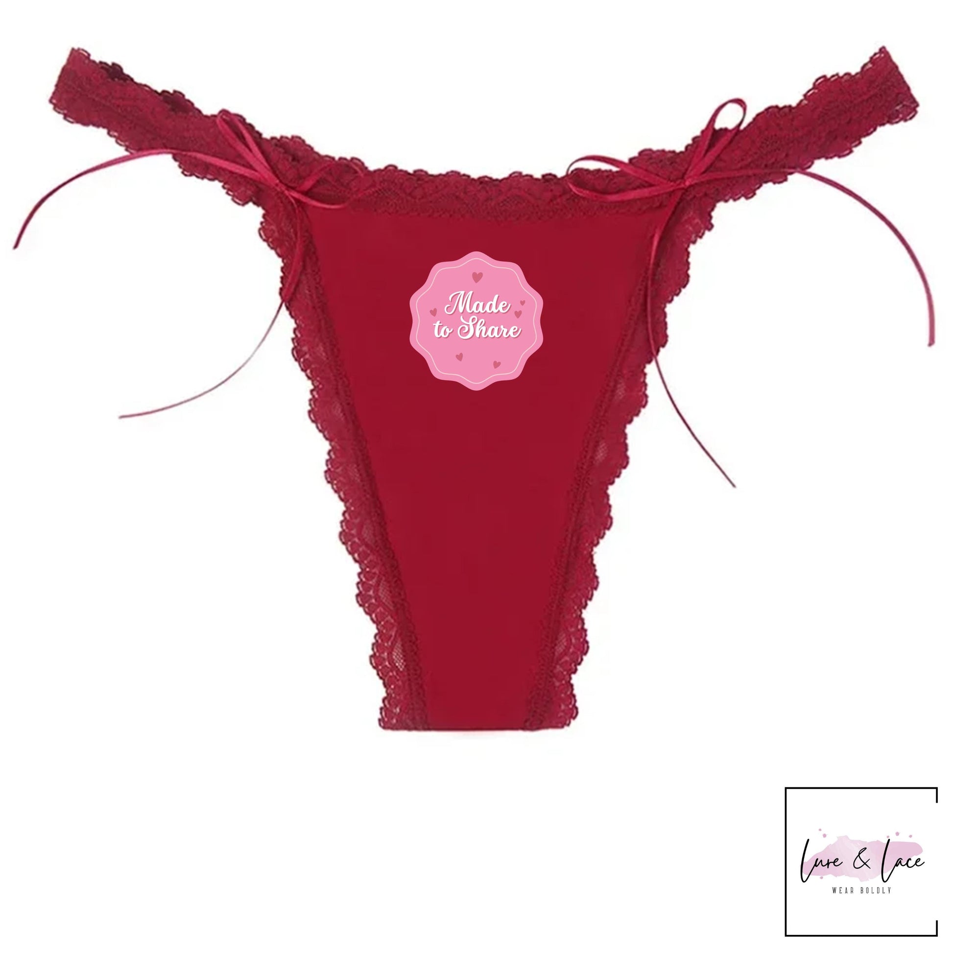 Adding this bold, naughty thong to your lingerie collection will elevate your confidence and enhance your intimate experiences. Its provocative design, combined with superior comfort, makes it a must-have for lovers of excitement and adventure. Whether you're stepping into a roleplay scenario, exploring new facets of your sexuality, or simply indulging in self-love, this piece is your perfect companion. Embrace your wild side, celebrate your sensuality, and make every moment memorable with the Made to Share Thong—your ultimate hotwife lingerie choice.