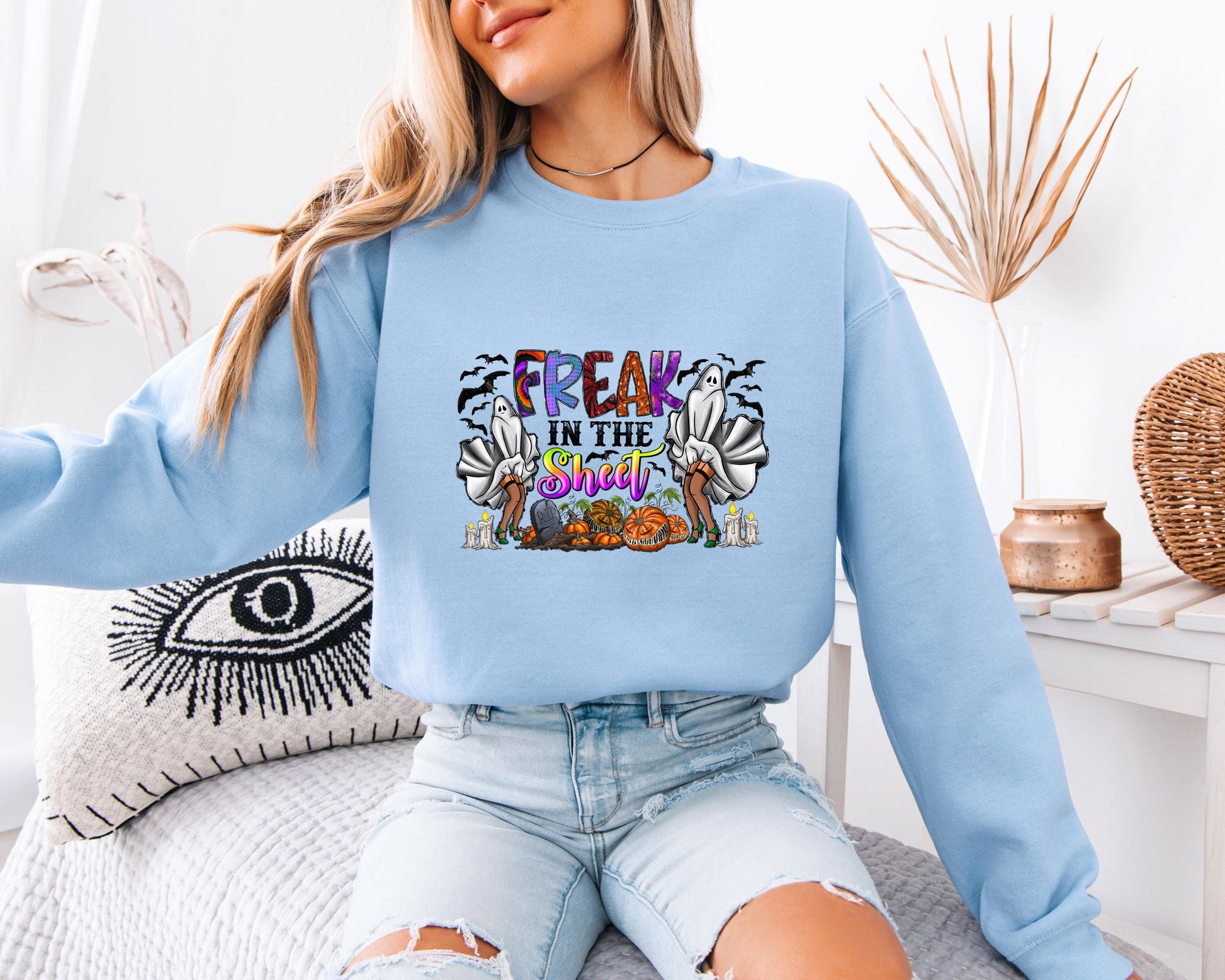 Add this Freak in the Sheets sweatshirt to your cart today and let your Halloween spirit shine (and maybe get a few laughs along the way).Embrace the spirited vibes of the season with this cozy Crewneck Sweatshirt, perfect for all your festive gatherings. It features a whimsical design that combines fun and edge, ideal for Halloween celebrations or casual get-togethers. Its soft fabric makes it a comfort staple for chilly evenings while adding a playful touch to your wardrobe. This versatile sweatshirt is perfect for individuals who enjoy a mix of humor and style, making it a great gift for friends or family looking to express their unique personality. Whether you're hosting a spooky movie night or attending a costume party, this sweatshirt will surely make a statement and keep you comfortable. Perfect for the fall season, Halloween, or just adding some fun to your everyday look.